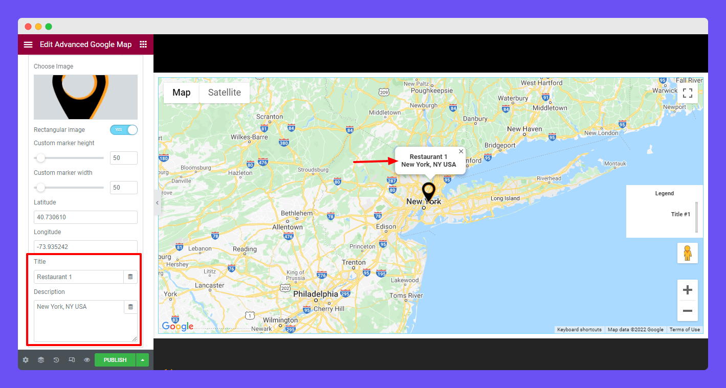 You are able to add a Marker Title and Description. Here, we’ve added our restaurant number into the Title area and address in the Description area.