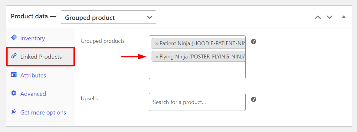 Then, click on Linked Products. You will get the grouped products box like the one below. Just type the product names where you want to offer in a cluster.